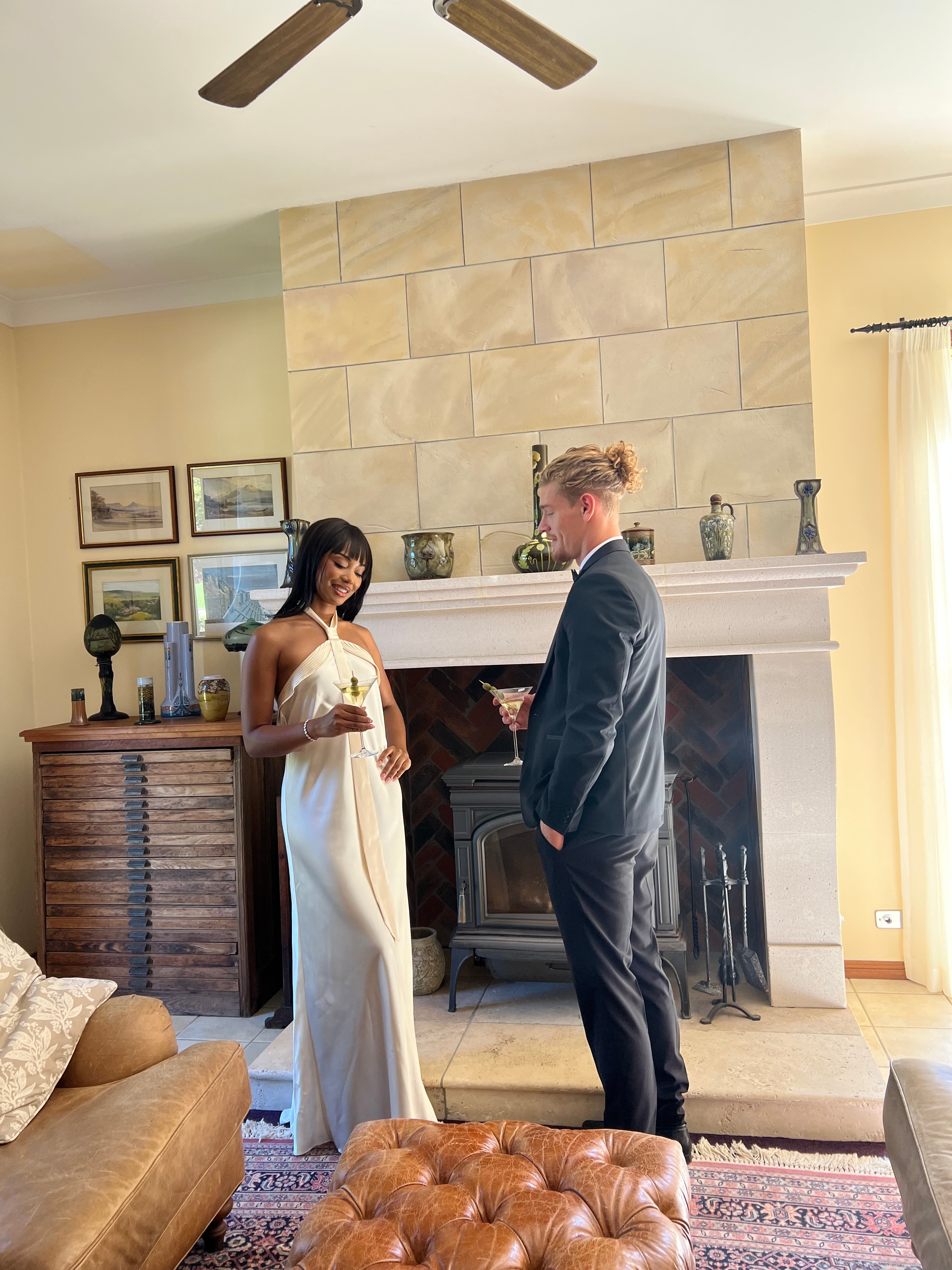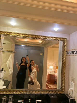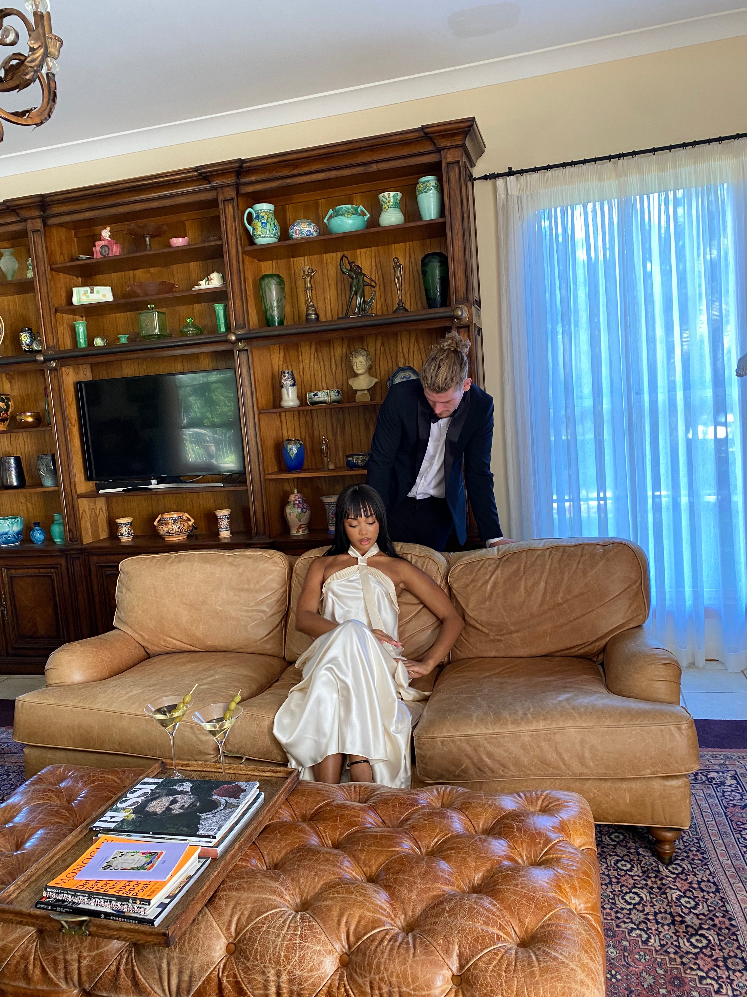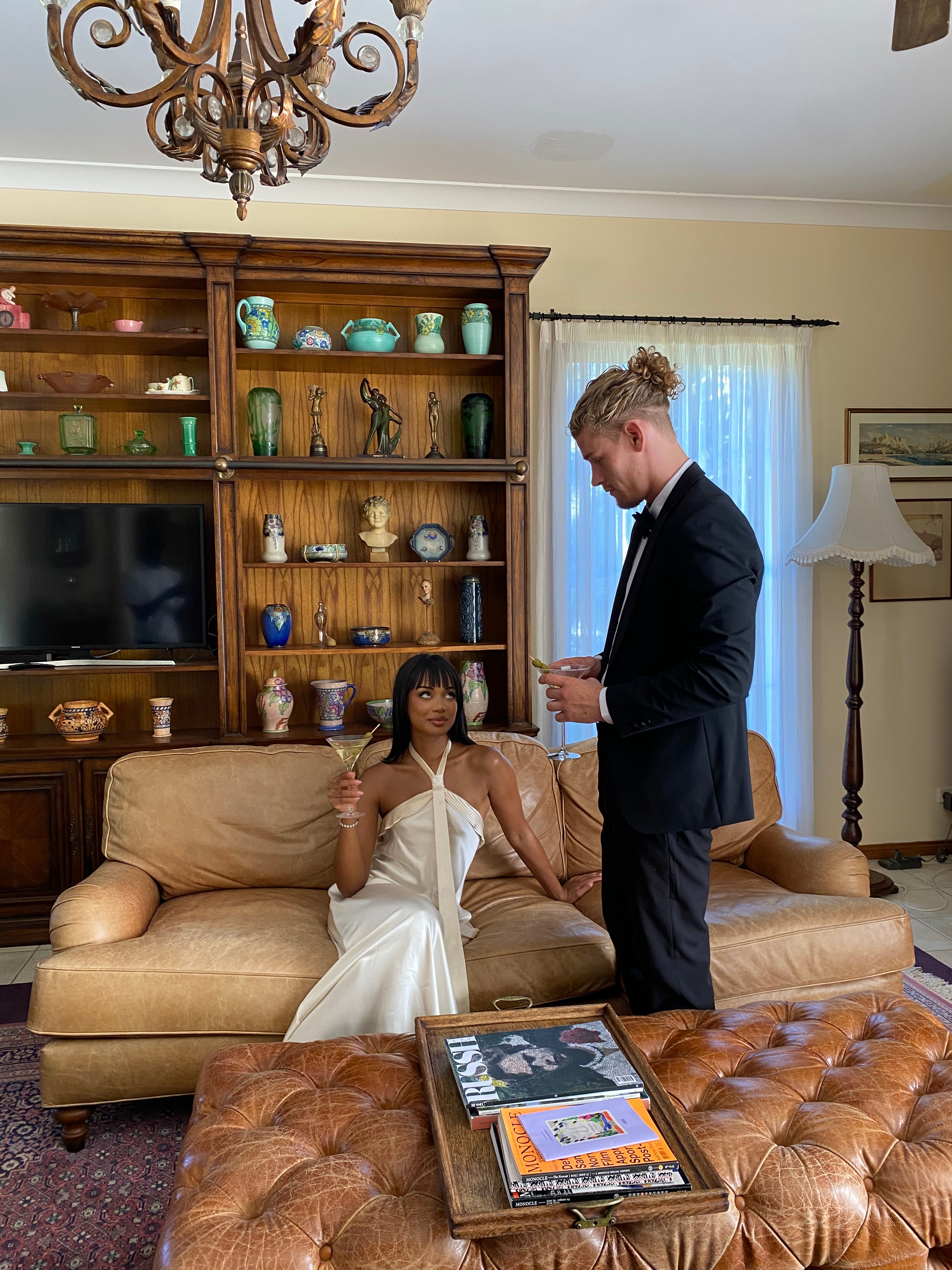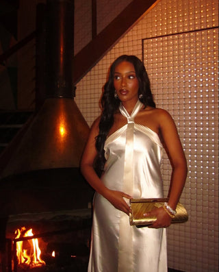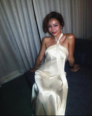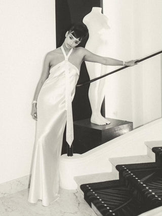 A nod to old-money elegance. Crafted from a luxurious silk satin blend, this gown features a halter neck design that gracefully ties at the front, allowing for a customisable fit.