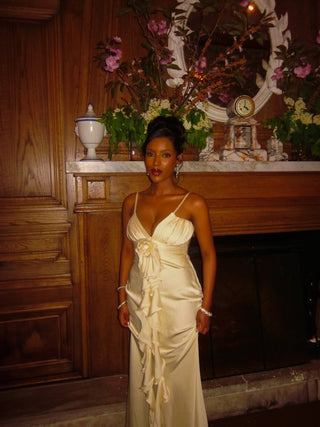 A luxurious cream silk gown, adorned with delicate frills and featuring an exquisitely crafted flower centrepiece, radiating elegance and timeless charm.