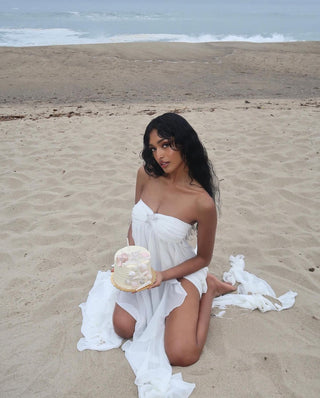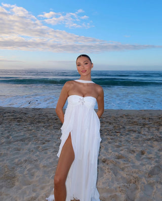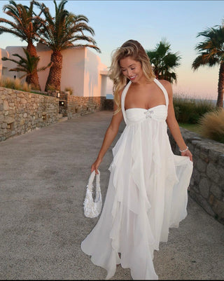 This gown features a flowing long hem and an alluring open back. At its heart, a delicate diamond star embellishment graces the center of the chest, adding just the right touch of sparkle. Crafted from wavy chiffon, the fabric moves effortlessly with every step.