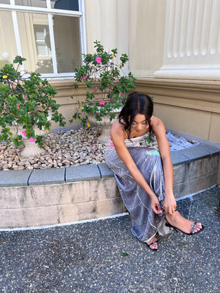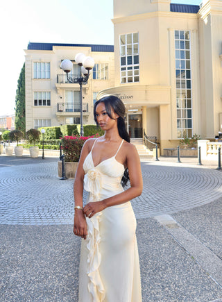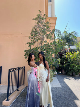 A sun-drenched silk slip dress, clinging to every curve—a love letter to the golden age of glamour.